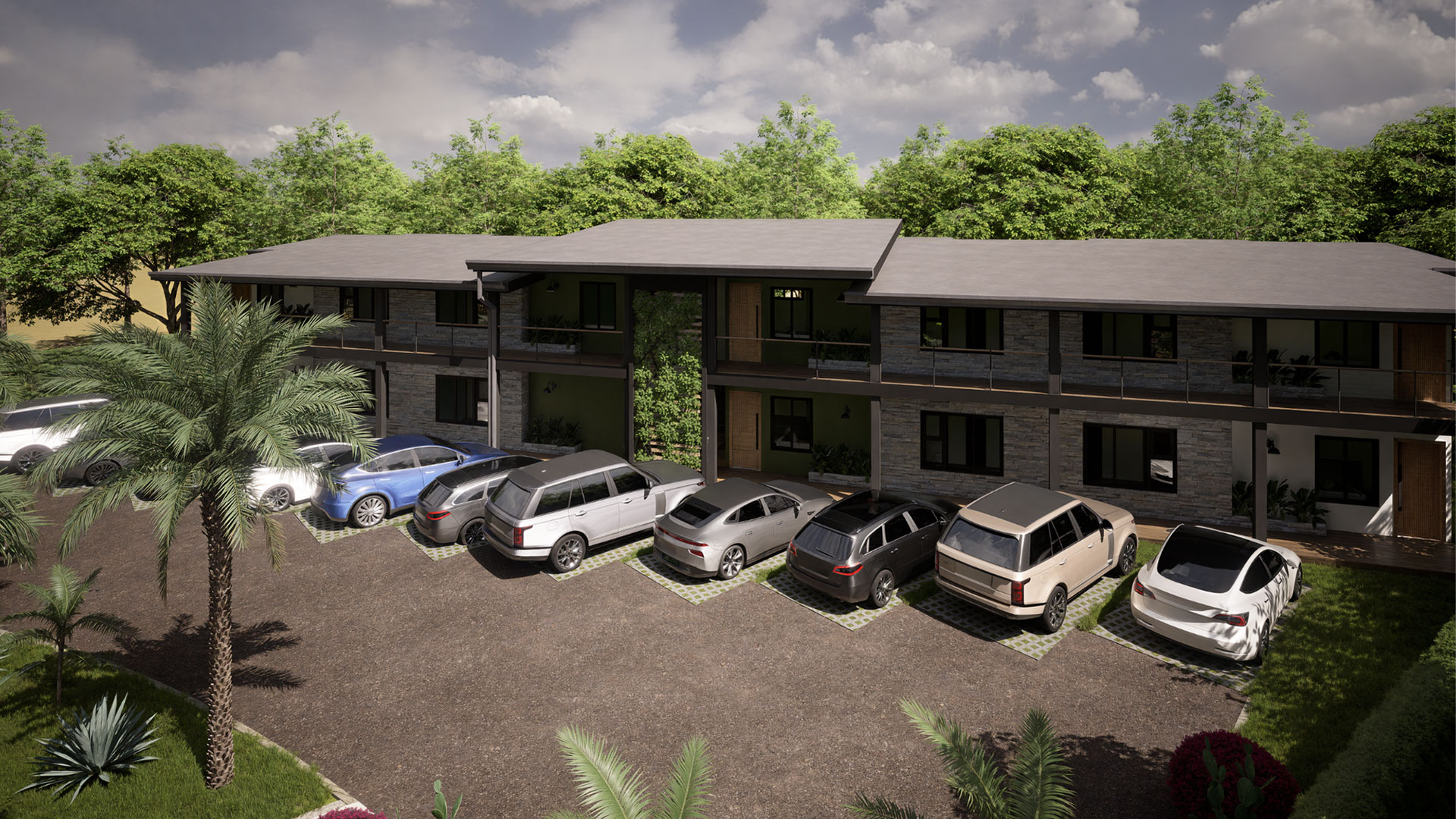 Cada apartamento cuenta con una superficie aproximada de 50 m², distribuidos estratégicamente en dos habitaciones, un baño completo, sala, comedor, cocina y área de lavandería, logrando un balance entre funcionalidad y comodidad. El conjunto residencial se organiza en dos niveles, con fachadas que combinan texturas y materiales en tonos naturales, aportando modernidad y calidez al diseño arquitectónico. Grandes ventanales enmarcan las estancias, permitiendo una excelente iluminación natural y ventilación cruzada, lo que garantiza interiores frescos y agradables.