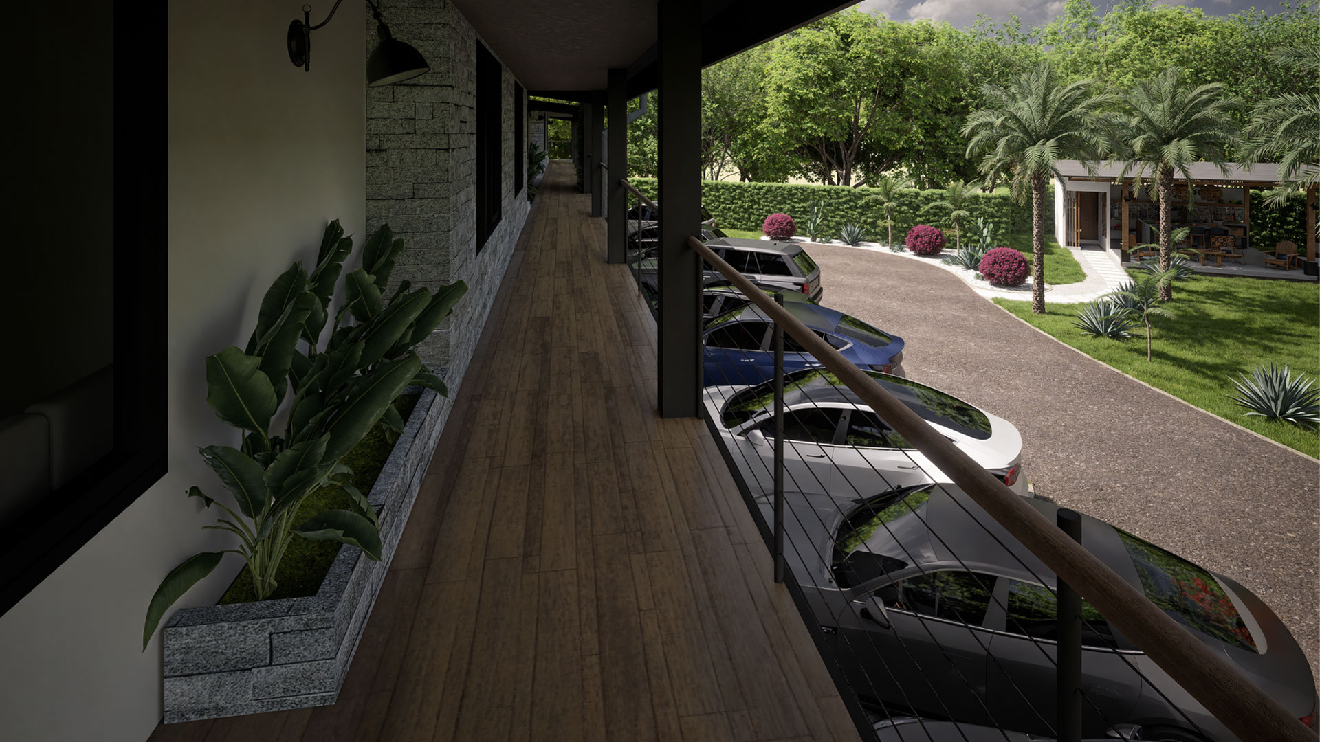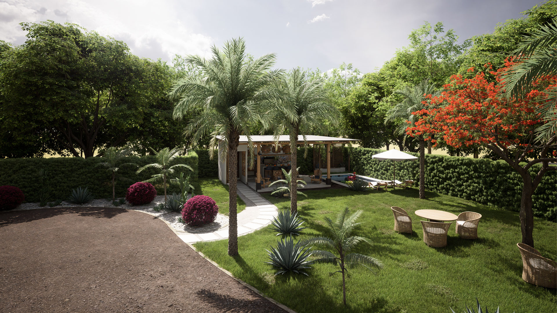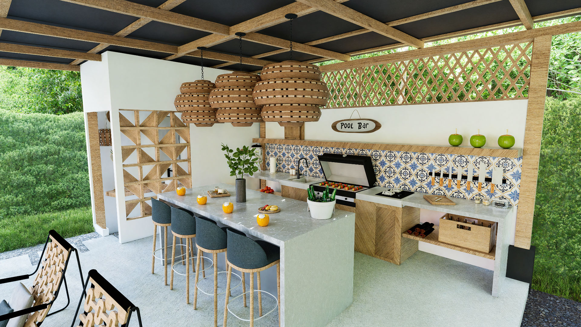 Como parte de las amenidades comunes, el proyecto incluye una zona de rancho equipada con cocina BBQ, isla central y un baño completo, diseñada como punto de encuentro para actividades sociales y familiares. A su vez, la piscina y las áreas de descanso complementan el conjunto, generando un ambiente de relajación y esparcimiento para todos los residentes.