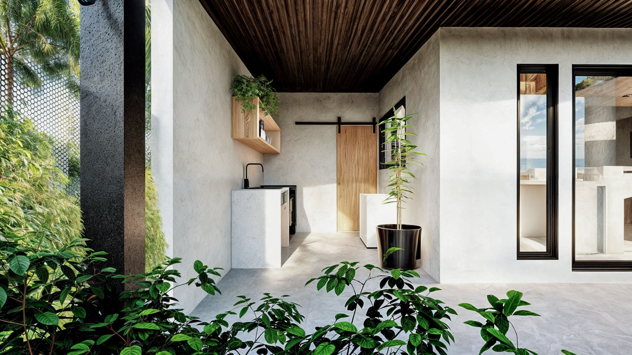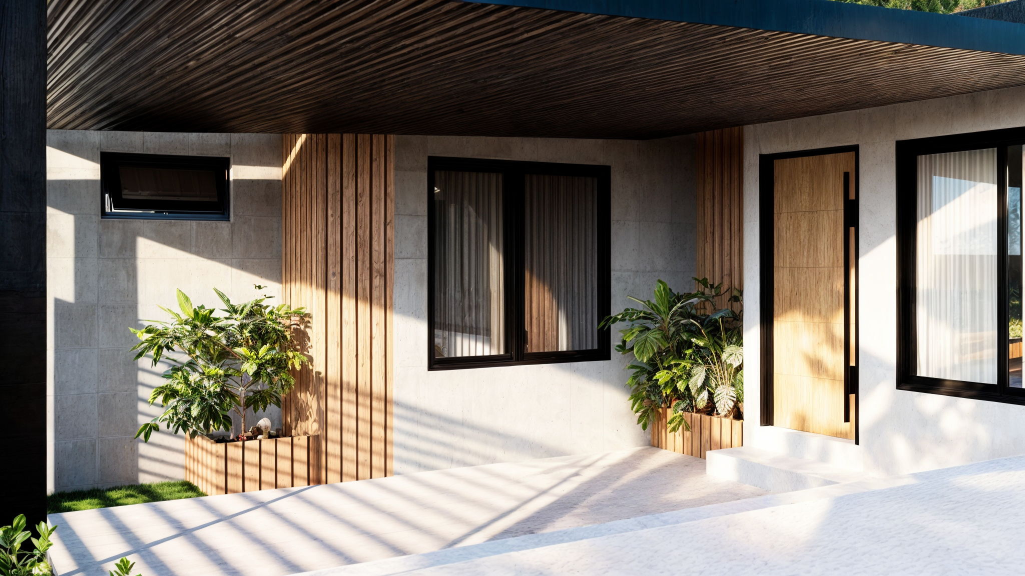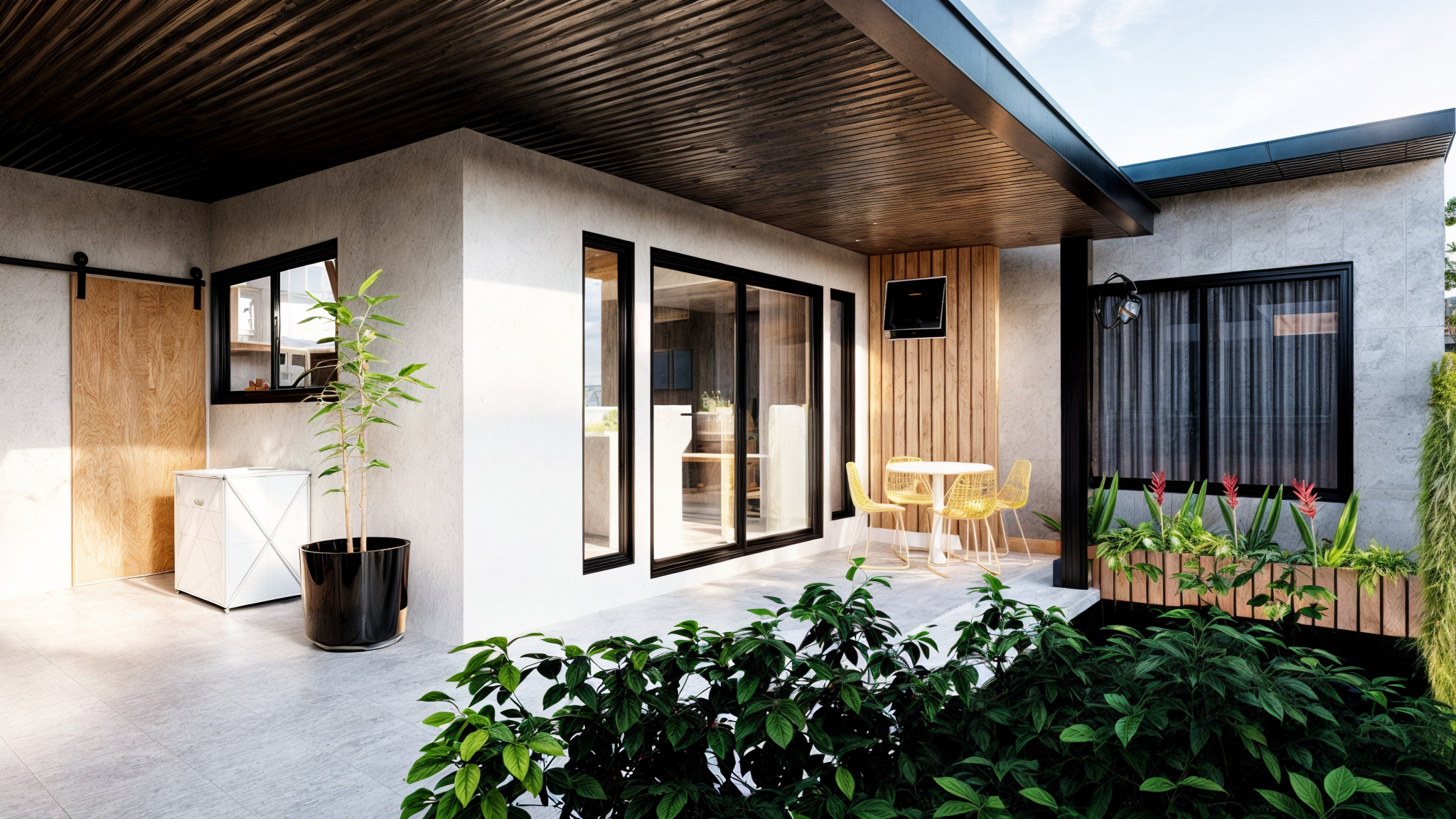Texture Nook es una innovadora vivienda diseñada para una pareja que busca un hogar propio lleno de vida y armonía. Este proyecto residencial es un santuario de texturas, luz solar y vegetación, creado para ofrecer una experiencia de vida única y acogedora. Cada rincón de Texture Nook está cuidadosamente planeado para conectar a sus habitantes con la naturaleza. Las paredes están adornadas con listones de madera y concreto en tonos grises y blancos, creando un ambiente moderno y sofisticado. Grandes ventanales y tragaluces permiten que la luz natural inunde los espacios interiores, resaltando la belleza de los detalles arquitectónicos y ofreciendo vistas espectaculares del entorno verde que rodea la casa. La integración de plantas y jardines interiores aporta frescura y vitalidad, convirtiendo a Texture Nook en un verdadero oasis de bienestar.