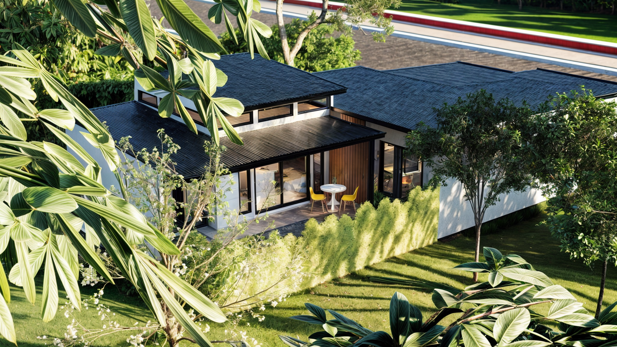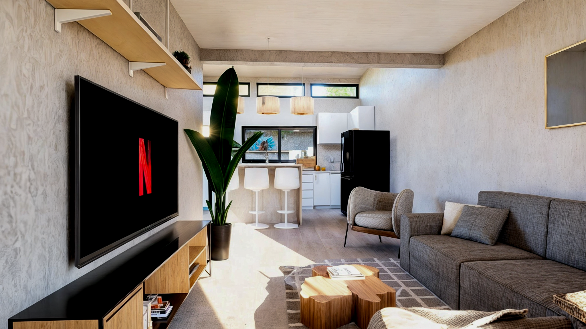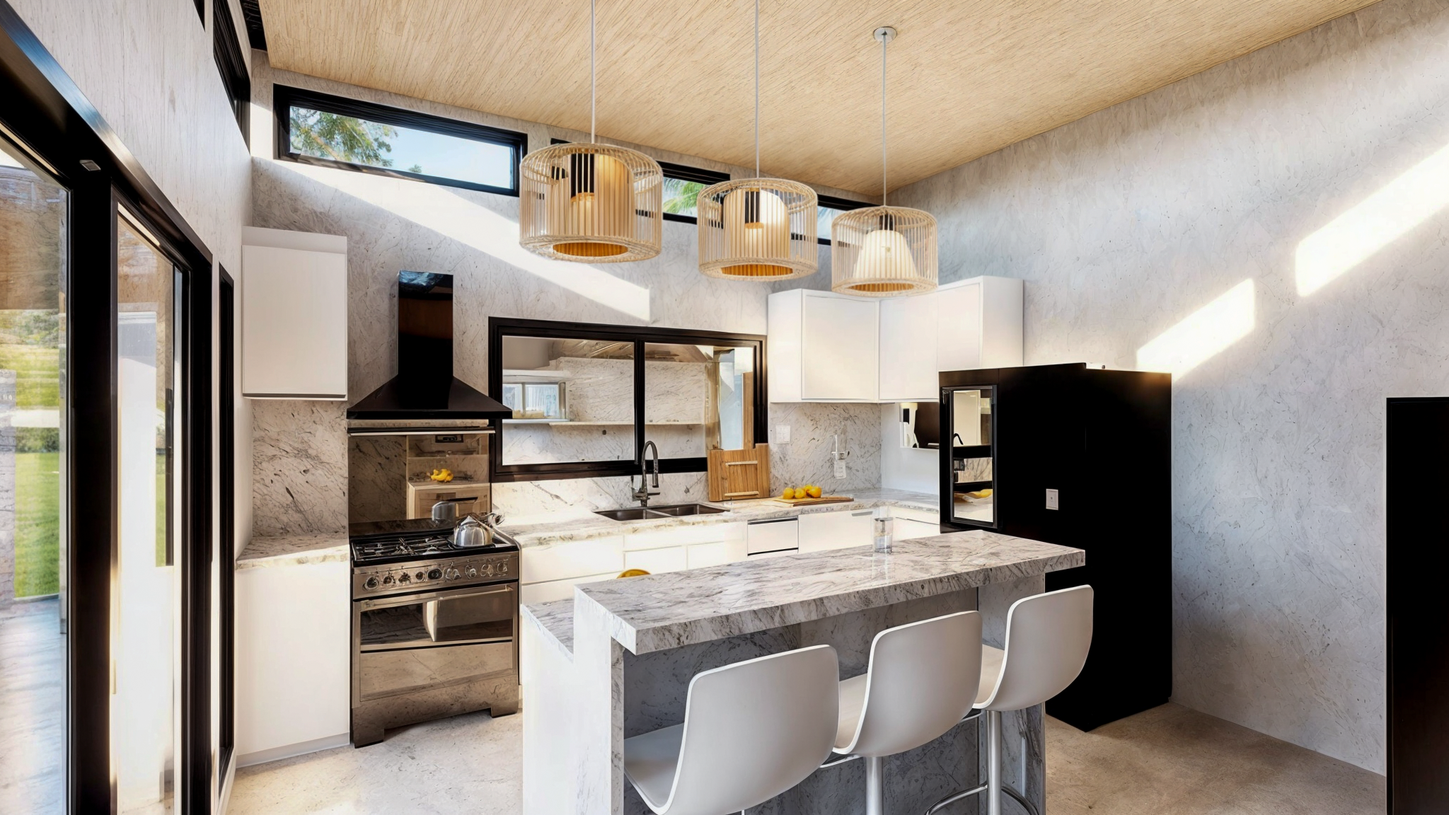 Texture Nook es una innovadora vivienda diseñada para una pareja que busca un hogar propio lleno de vida y armonía. Este proyecto residencial es un santuario de texturas, luz solar y vegetación, creado para ofrecer una experiencia de vida única y acogedora. Cada rincón de Texture Nook está cuidadosamente planeado para conectar a sus habitantes con la naturaleza. Las paredes están adornadas con listones de madera y concreto en tonos grises y blancos, creando un ambiente moderno y sofisticado. Grandes ventanales y tragaluces permiten que la luz natural inunde los espacios interiores, resaltando la belleza de los detalles arquitectónicos y ofreciendo vistas espectaculares del entorno verde que rodea la casa. La integración de plantas y jardines interiores aporta frescura y vitalidad, convirtiendo a Texture Nook en un verdadero oasis de bienestar.